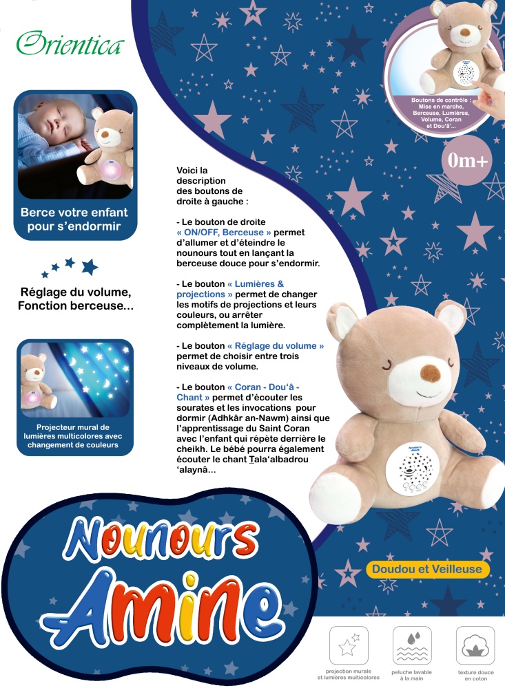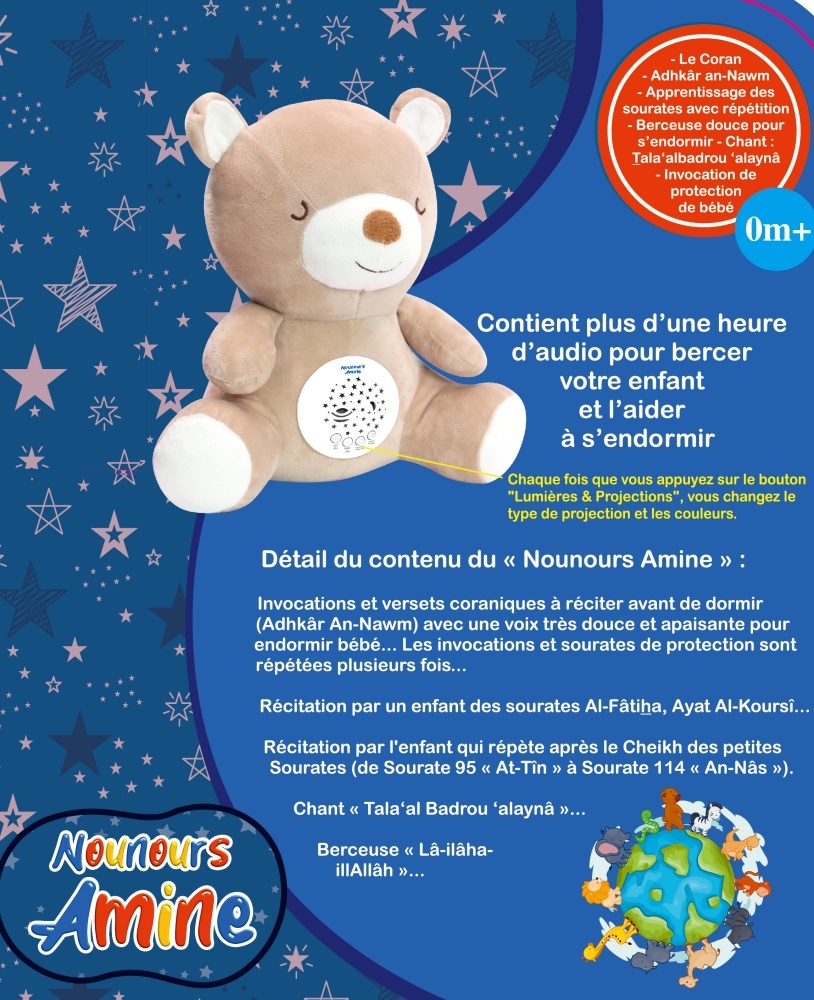 La peluche parlante (doudou) « Nounours Amine » contient plus d’une heure d’audio pour bercer votre enfant et l’aider à s’endormir : Le Coran – Adhkâr an-Nawm – Apprentissage des sourates avec répétition – Berceuse douce pour s’endormir – Chant  Tala‘albadrou ‘alaynâ – Invocation de protection de bébé…Nounours Amine : Doudou Ourson et Veilleuse Coranique pour enfant musulman et bébé